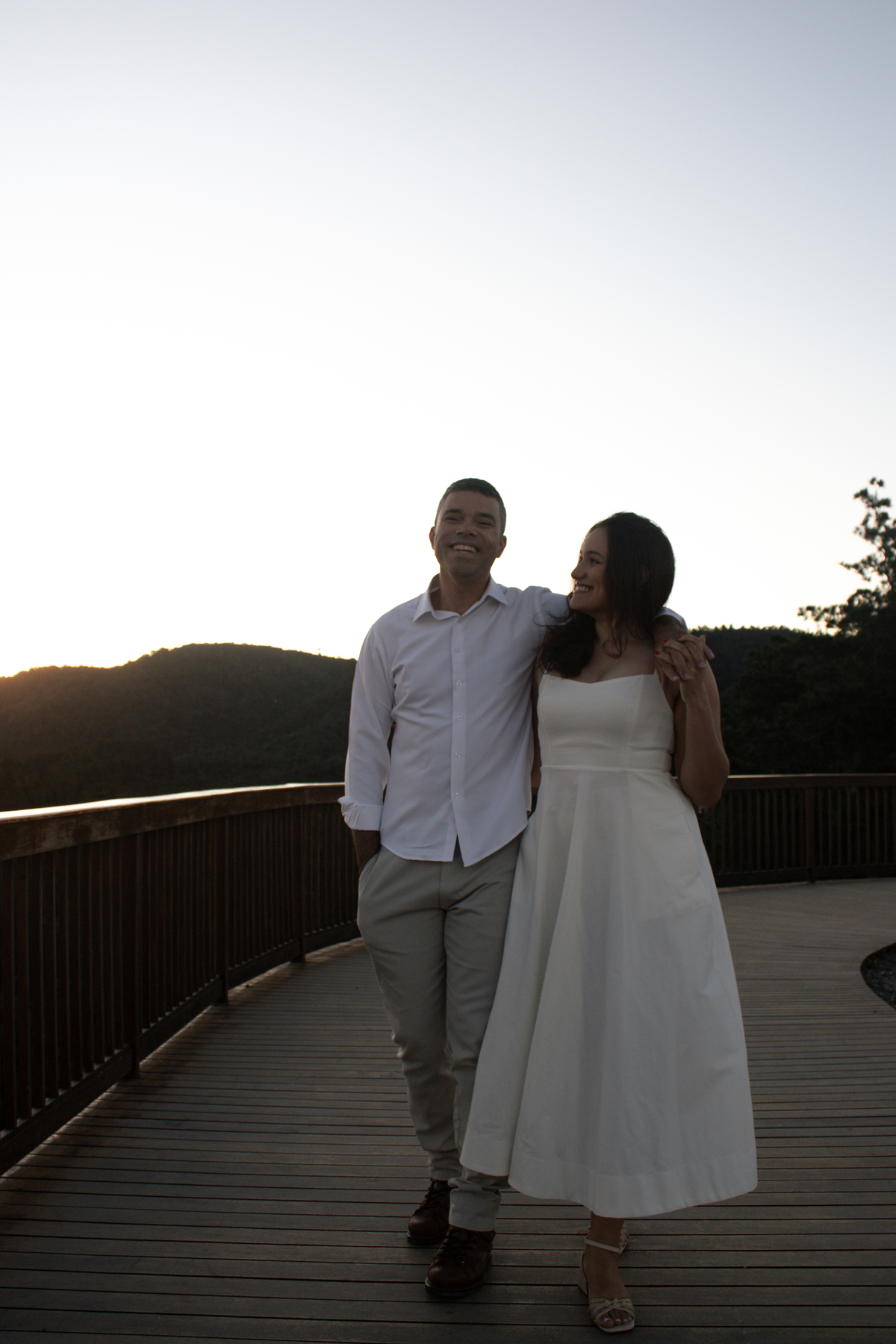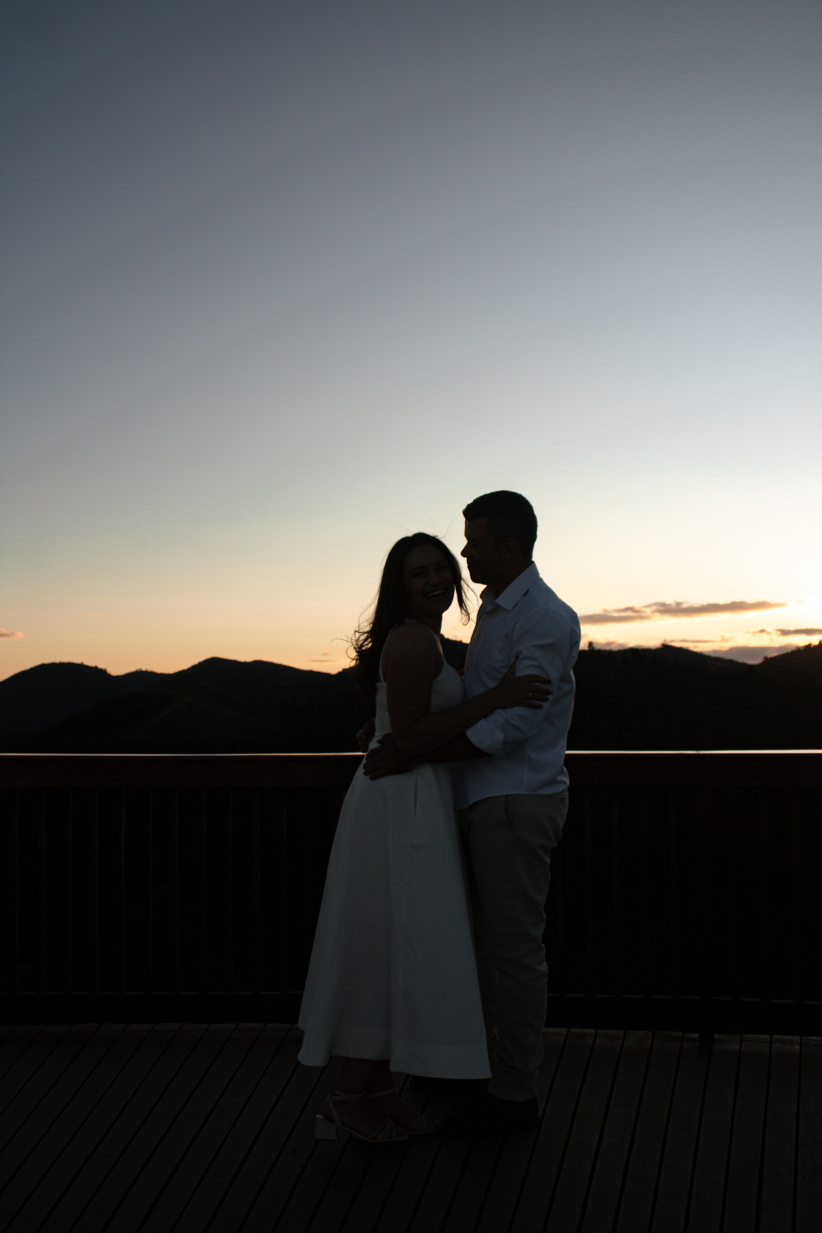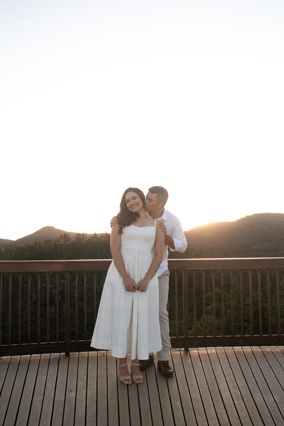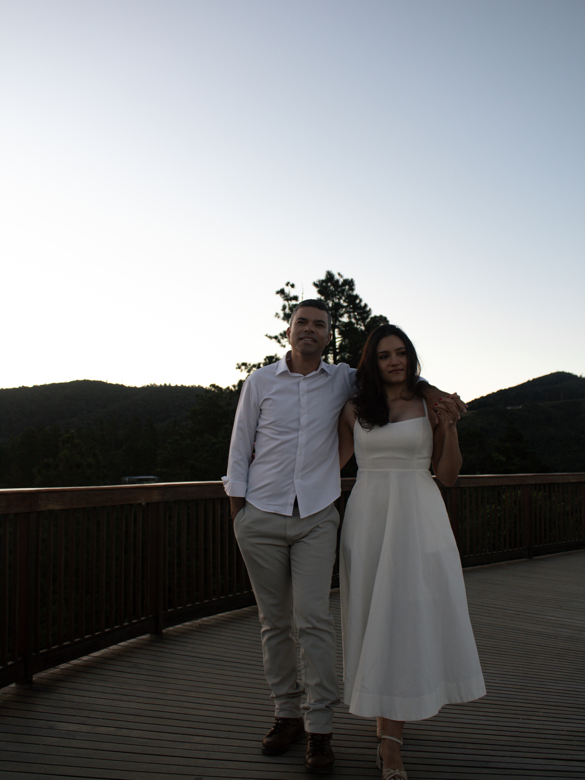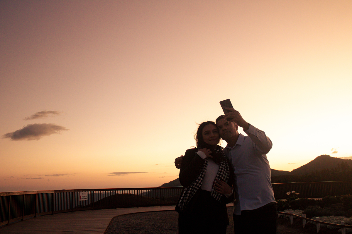 • Casal durante ensaio fotográfico no Pico do Itapeva ao pôr do sol com atmosfera leve.'